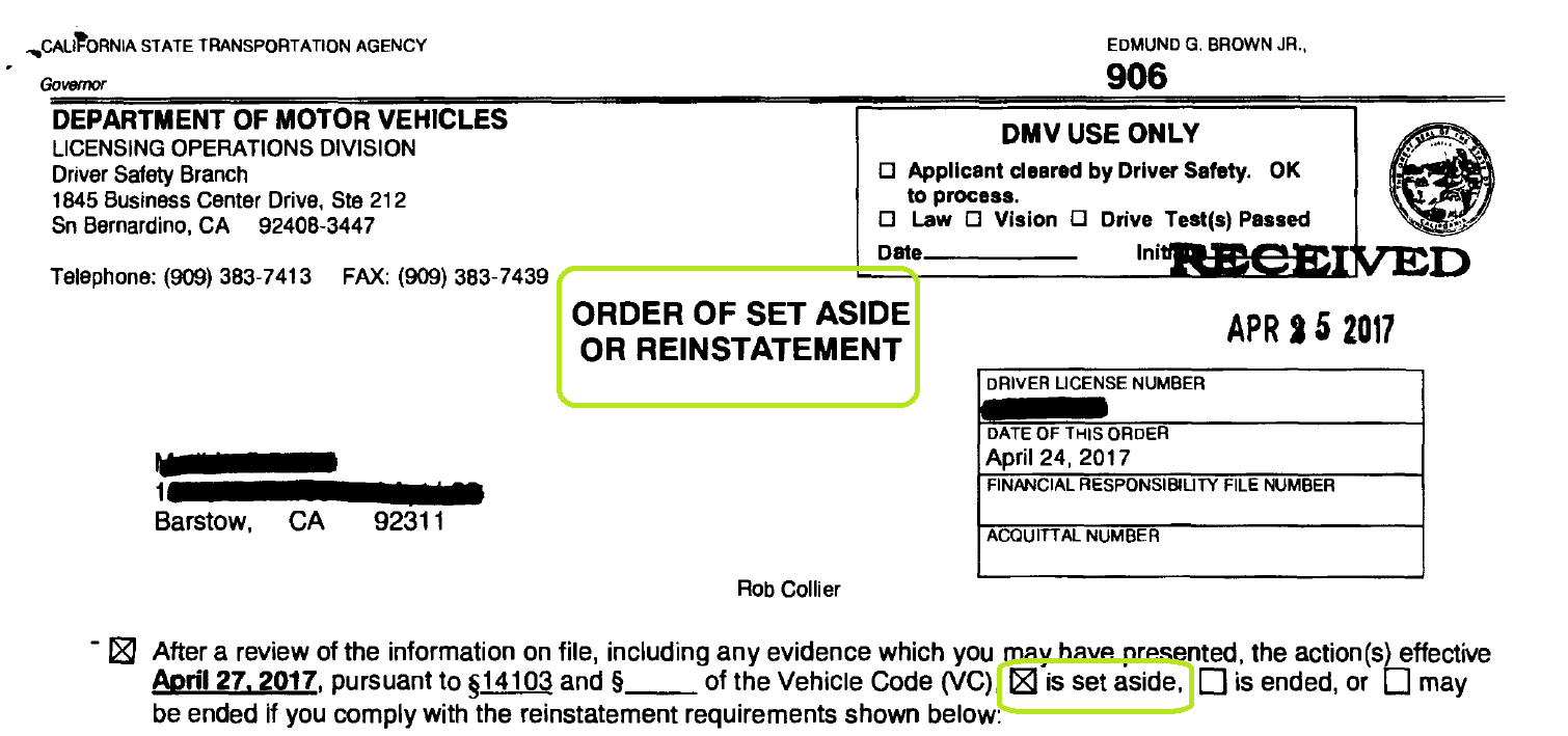 Outcome: At the conclusion of the Fraudulent Activity Hearing, the DMV Hearing Officer took the matter under submission.  Two days later, we received the Hearing Officer’s decision in the mail.  He had completely “Set Aside” the allegation and cleared our Client to resume the application process.