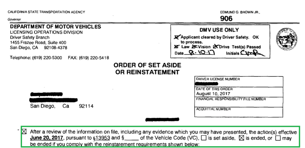 Even though the police had cleared our Client of any suspicion that he was impaired, the DMV still presumed something was afoot. Based on that, they bypassed the officer’s request for Re-Examination. Instead, they ordered the immediate suspension of his driver license. This took him off the road and placed his job in jeopardy.